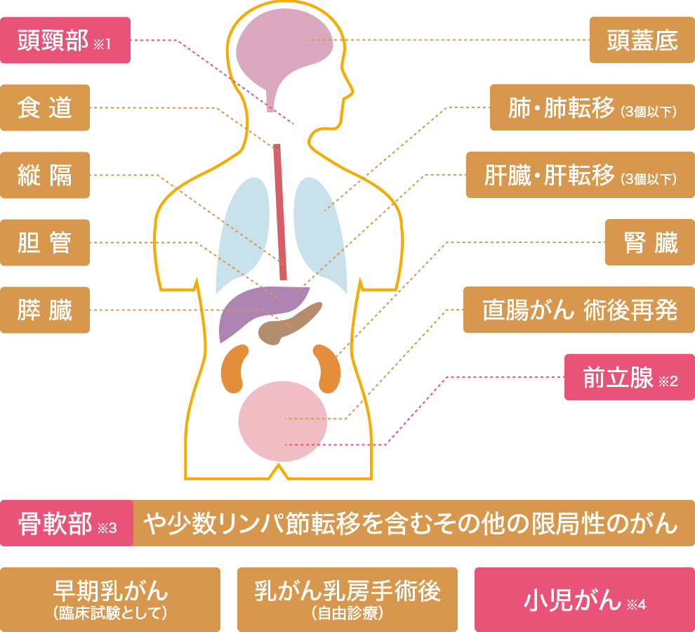 - ・骨軟部腫瘍(脊索腫、軟骨肉腫、骨肉腫など)(公的医療保険適用※3 2018年4月〜)